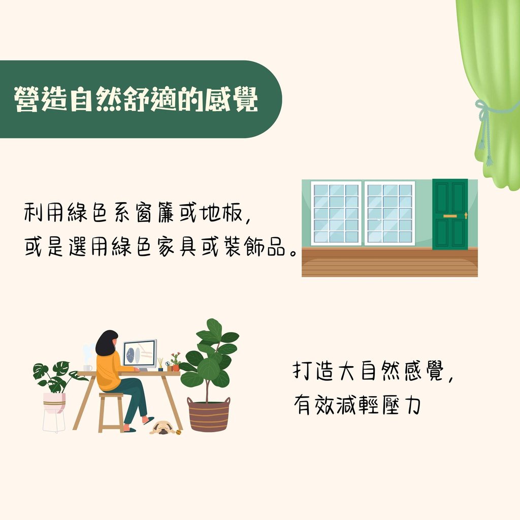 配色方案:利用綠色系窗簾或地板,或是選用綠色家具與裝飾品。