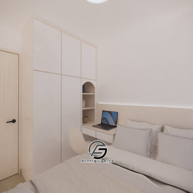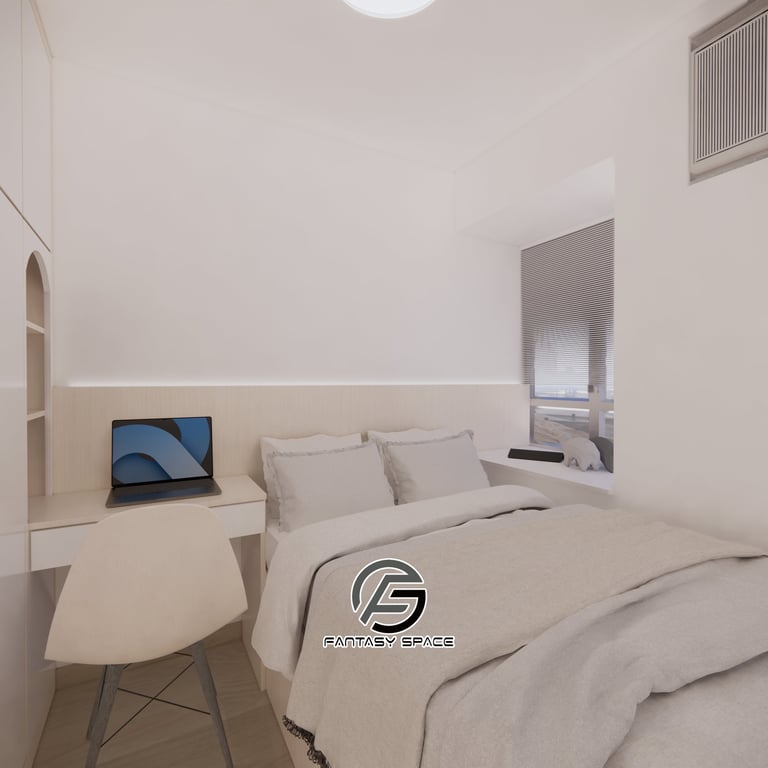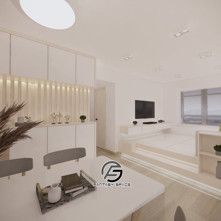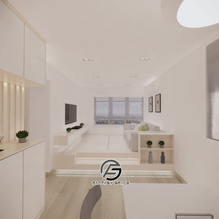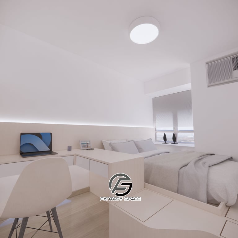 隱形收納魔法:針對 531 呎單位,我們利用通頂隱形櫃牆與地台設計,將雜物完全隱藏,維持視覺上的絕對純淨。